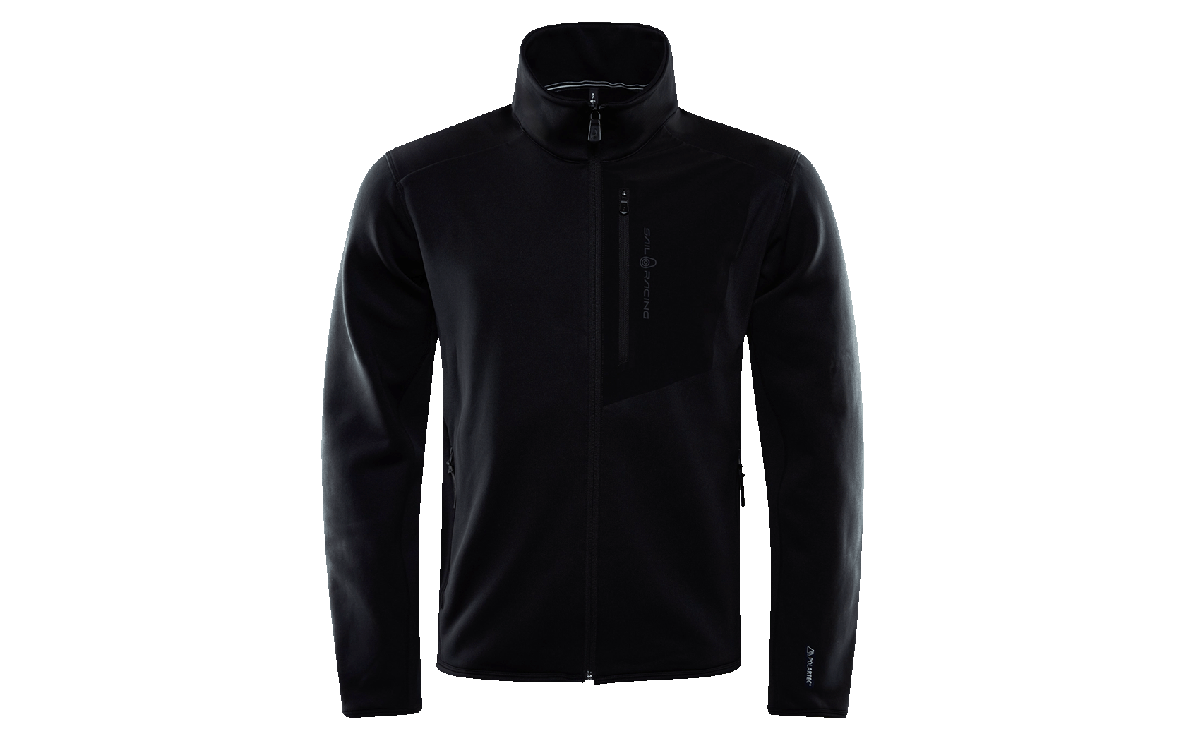 The jacket is crafted with a high collar that provides protection against wind intrusion and keeps the neck area warm. For practical storage options, the fleece jacket is equipped with two zippered waist pockets and a spacious chest pocket. The design features a Sail Racing logo printed vertically along the chest pocket zipper and a Polartec® logo printed on the left cuff, along with a Sail Racing bloc logo on the upper back.