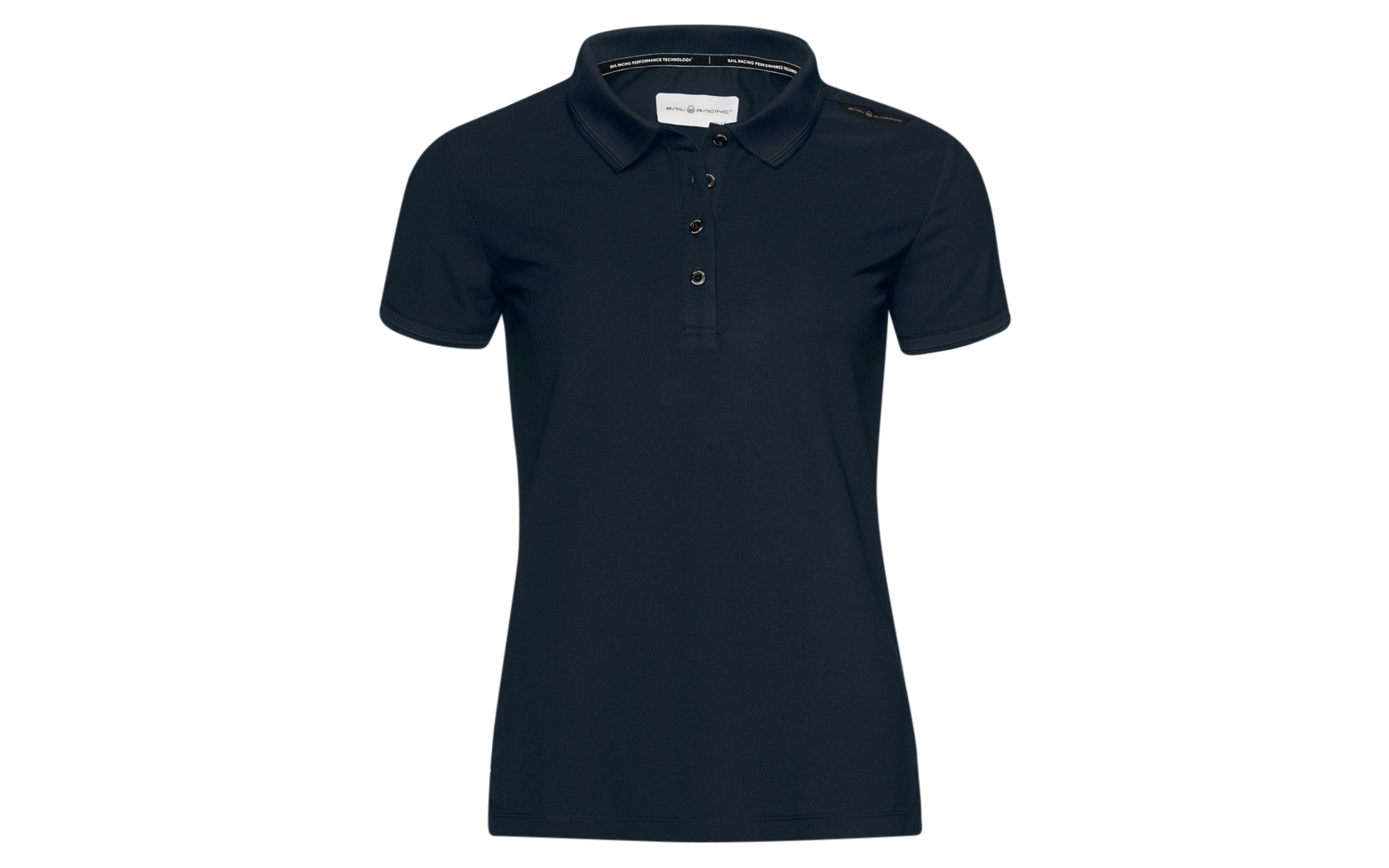 Women's Bow Tech Polo made in 100% polyester with high breathability. Sail Racing logo graphic at shoulder seam and bloc logo at back yoke. Transfer print as main label at inside neck and Sail Racing logo tape at slit. Flat knit for collar and sleeve end.